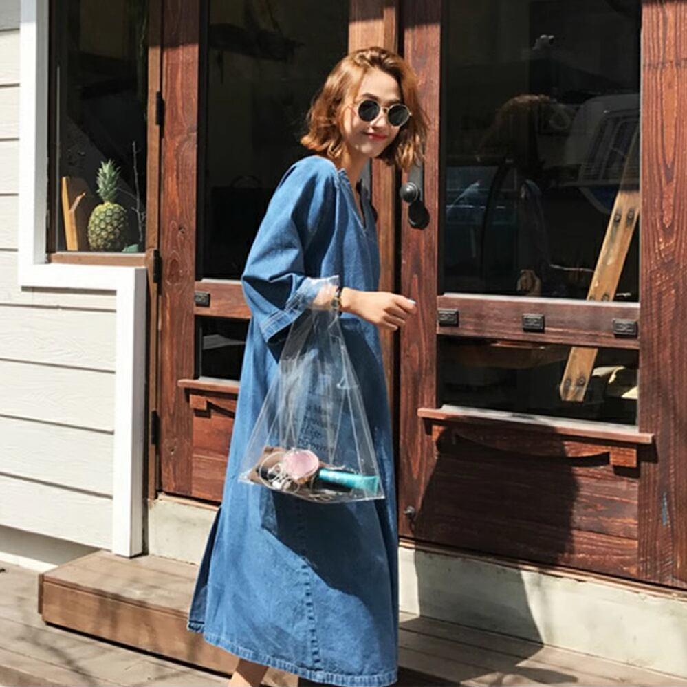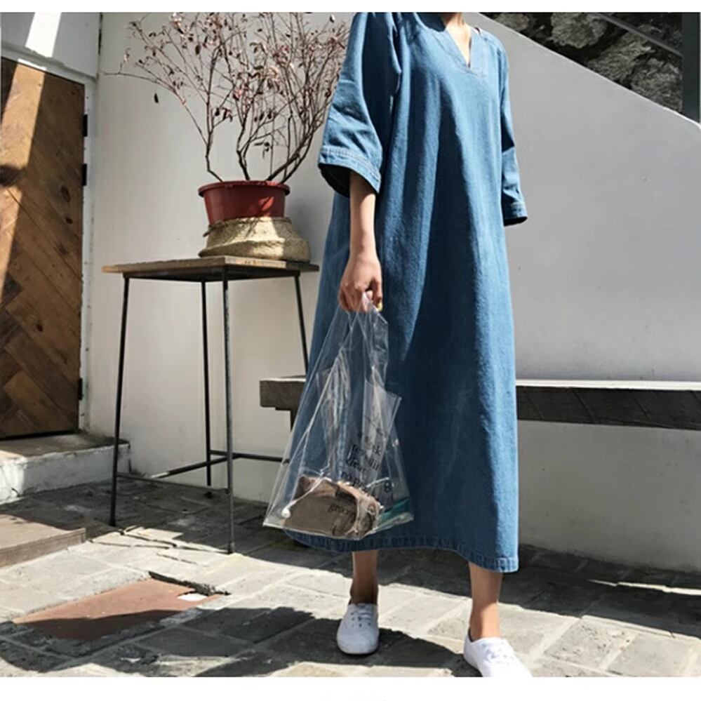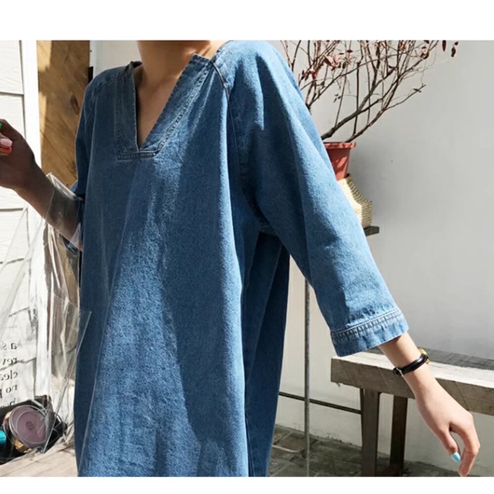 レディース デニム 七分袖 ロングワンピース Vネック S M L XL ブルー AS11473