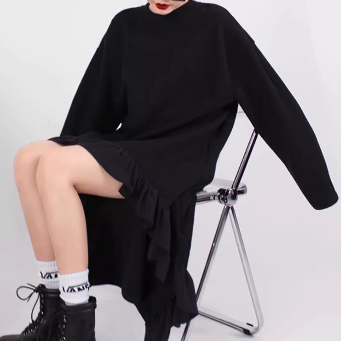 レディース アシンメトリーデザイン 長袖 ワンピース フリル ブラック 黒 AS11481