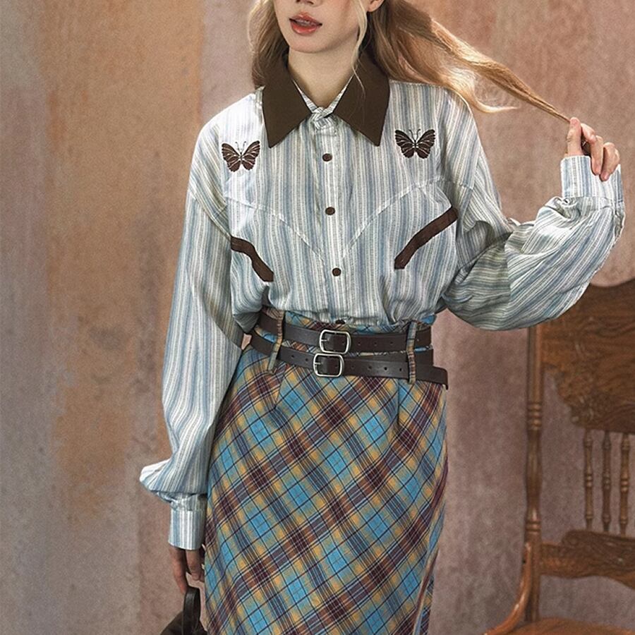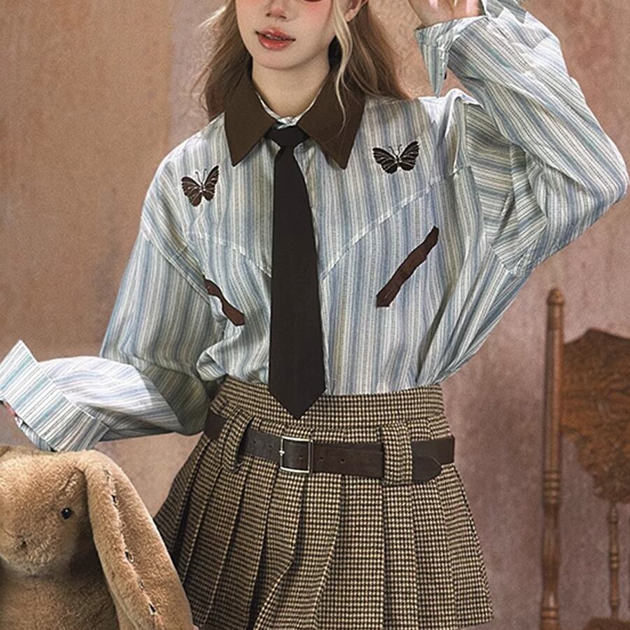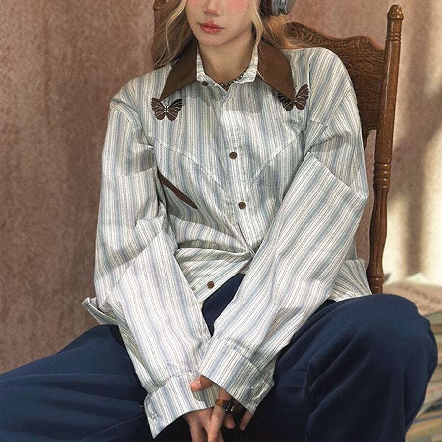 レディース 長袖 ストライプ柄 シャツ バタフライ 蝶 M L XL オーバーシルエット AS11495