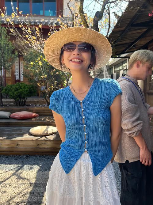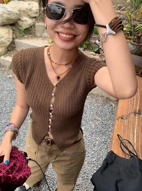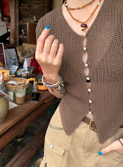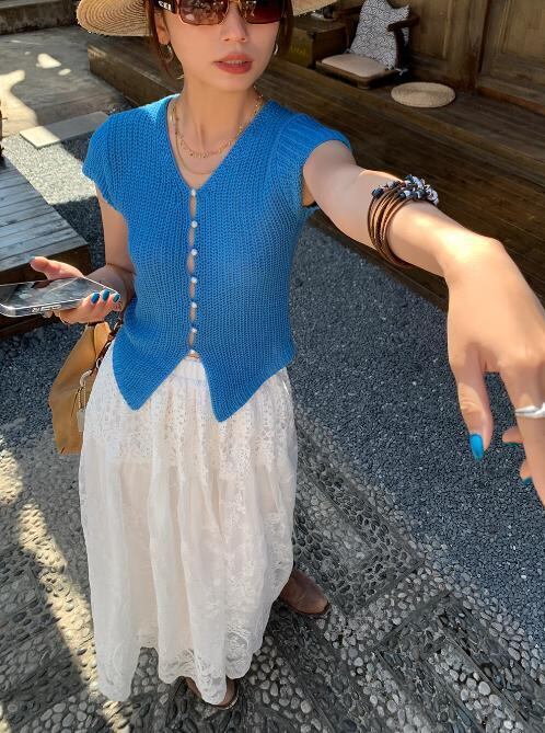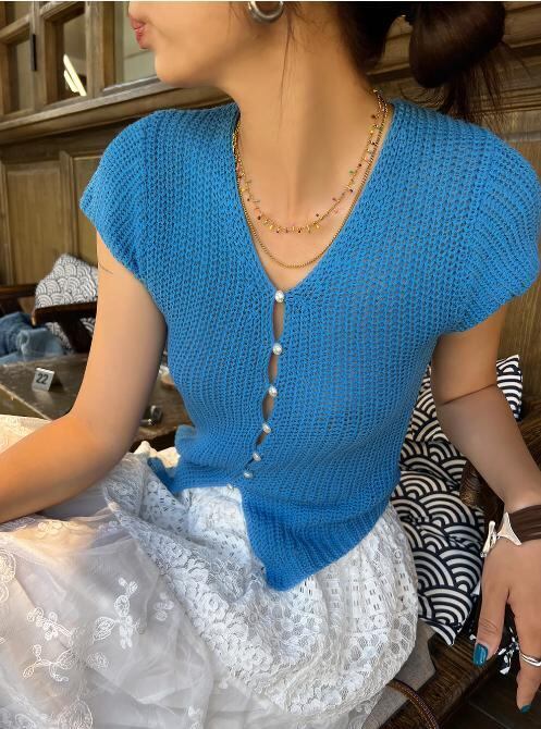 レディース トップス ニット スリムVネックパールボタン サマーニット 半袖 2color KS10421