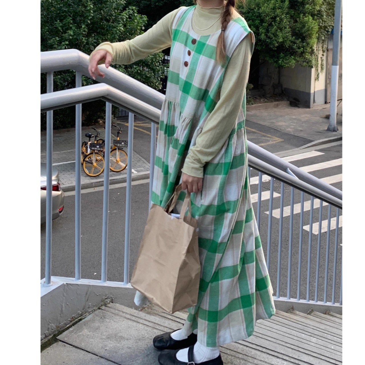 レディース チェック柄 ノースリーブワンピース ロング丈 コットン グリーン AS11522