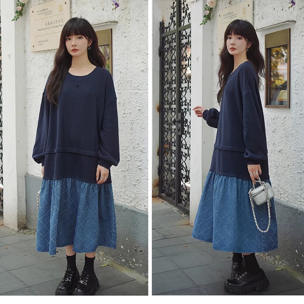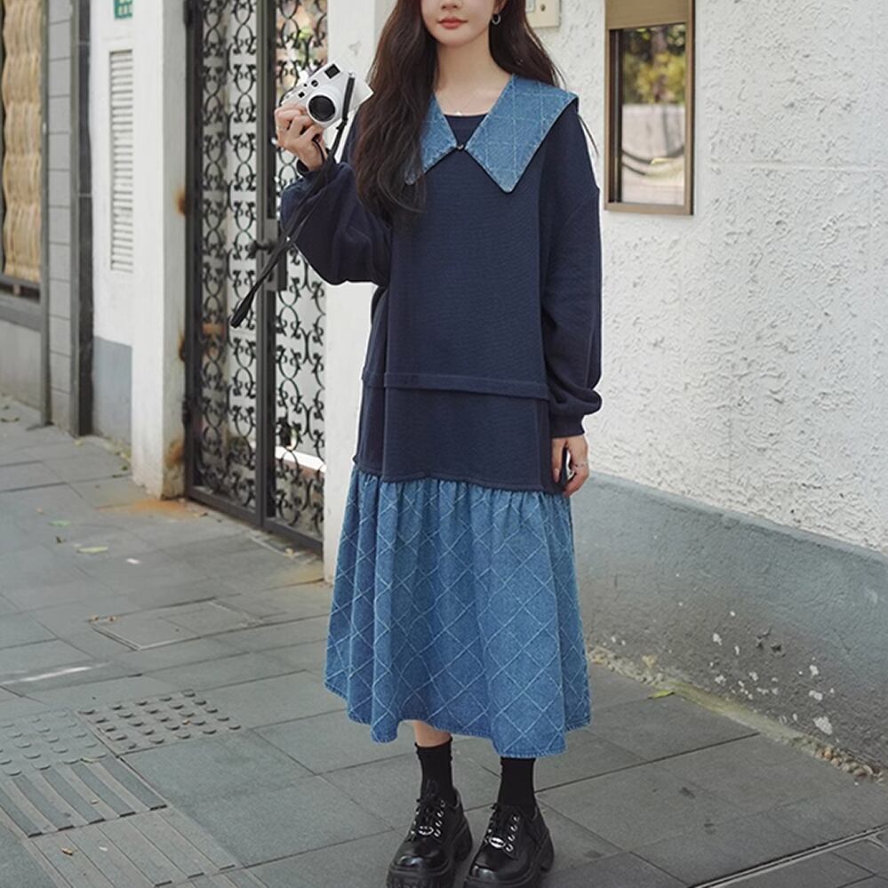 レディース デニム スウェット 長袖 ワンピース ロング丈 ビッグカラー S M L XL ブルー AS11527