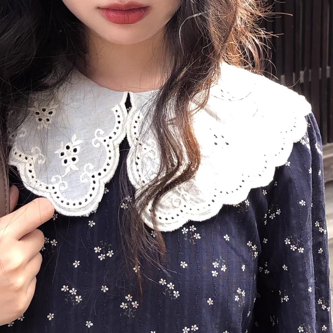 レディース 花柄 長袖 ビッグカラー ワンピース ロング丈 S M L ネイビー AS11530