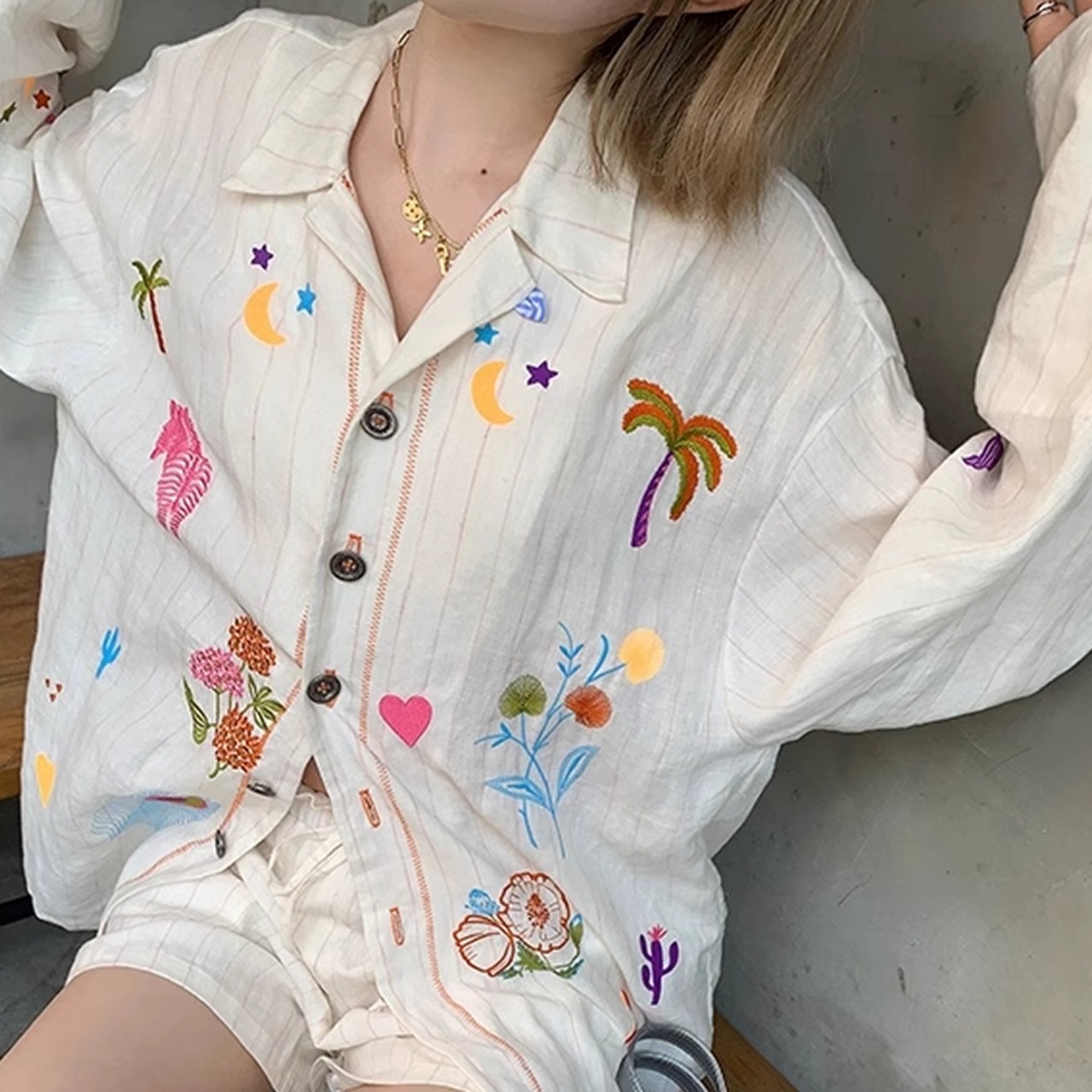 レトロ可愛い刺繍の長袖シャツ。