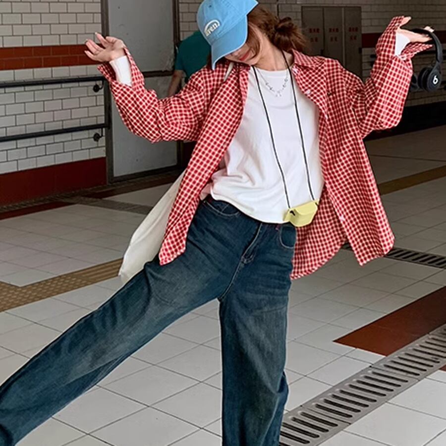 レディース チェック柄 長袖 シャツ S M レトロ 赤 レッド AS11544