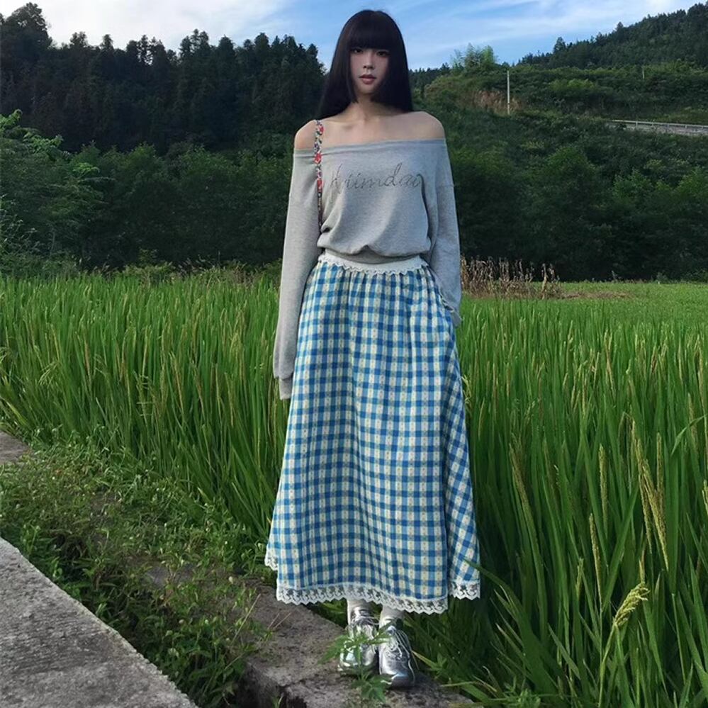 レディース チェック柄 ロングスカート 裾レース S M ブルー AS11554