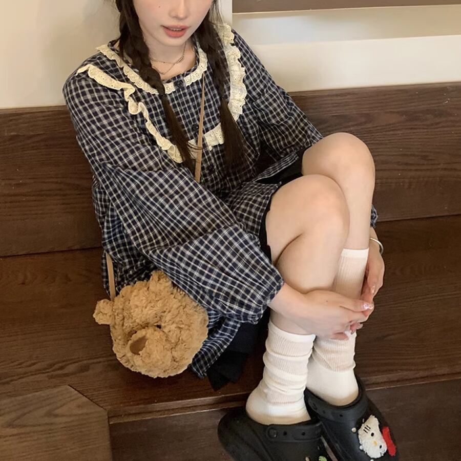 レディース チェック柄 長袖 フリル ワンピース ミニ丈 レトロガーリー AS11561