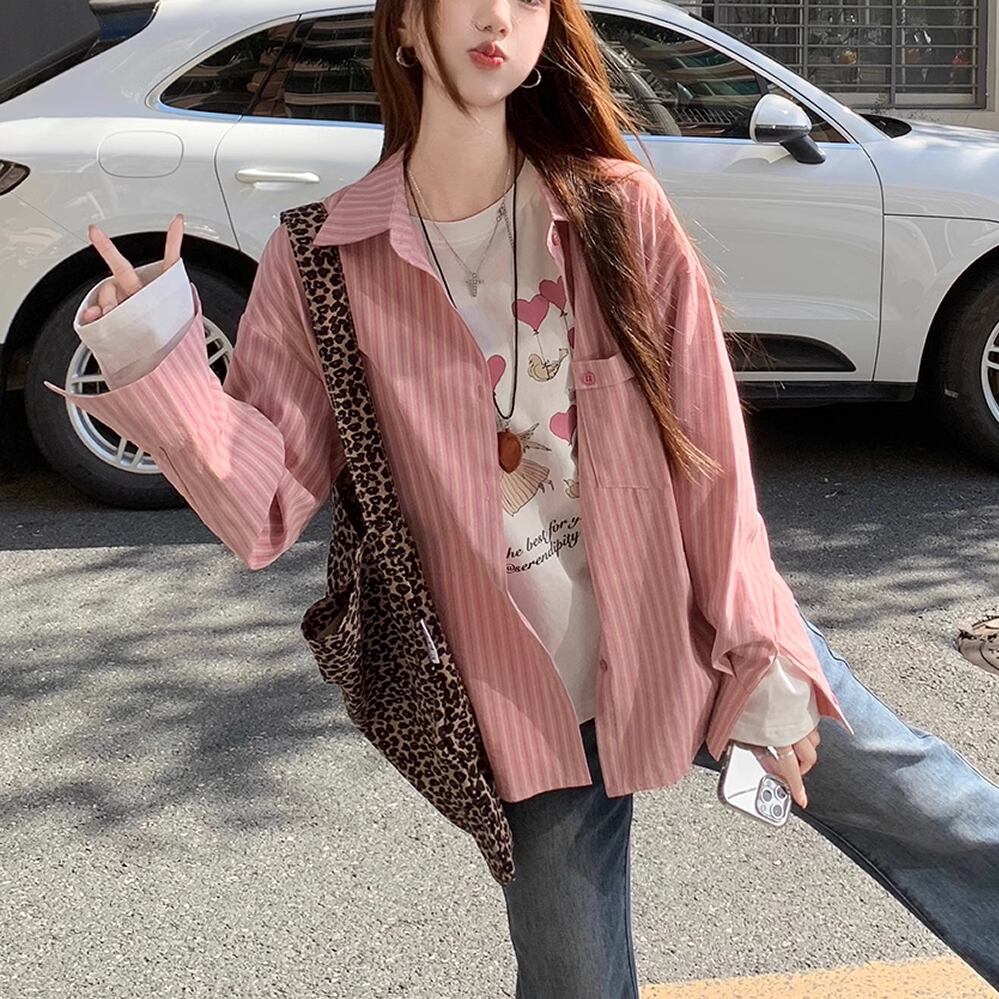 レディース ストライプ柄 長袖 シャツ ピンク AS11576