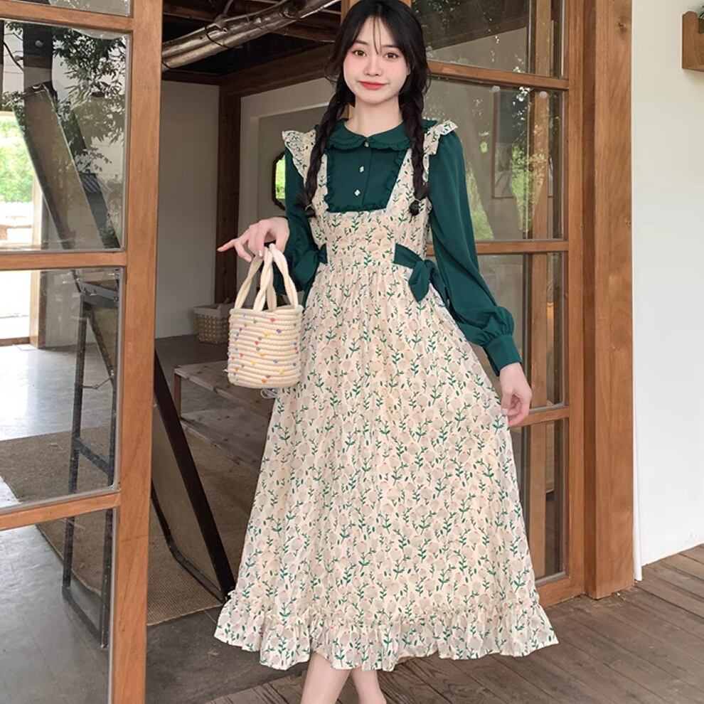 ブラウスとジャンパースカートのドッキングデザインのワンピース。