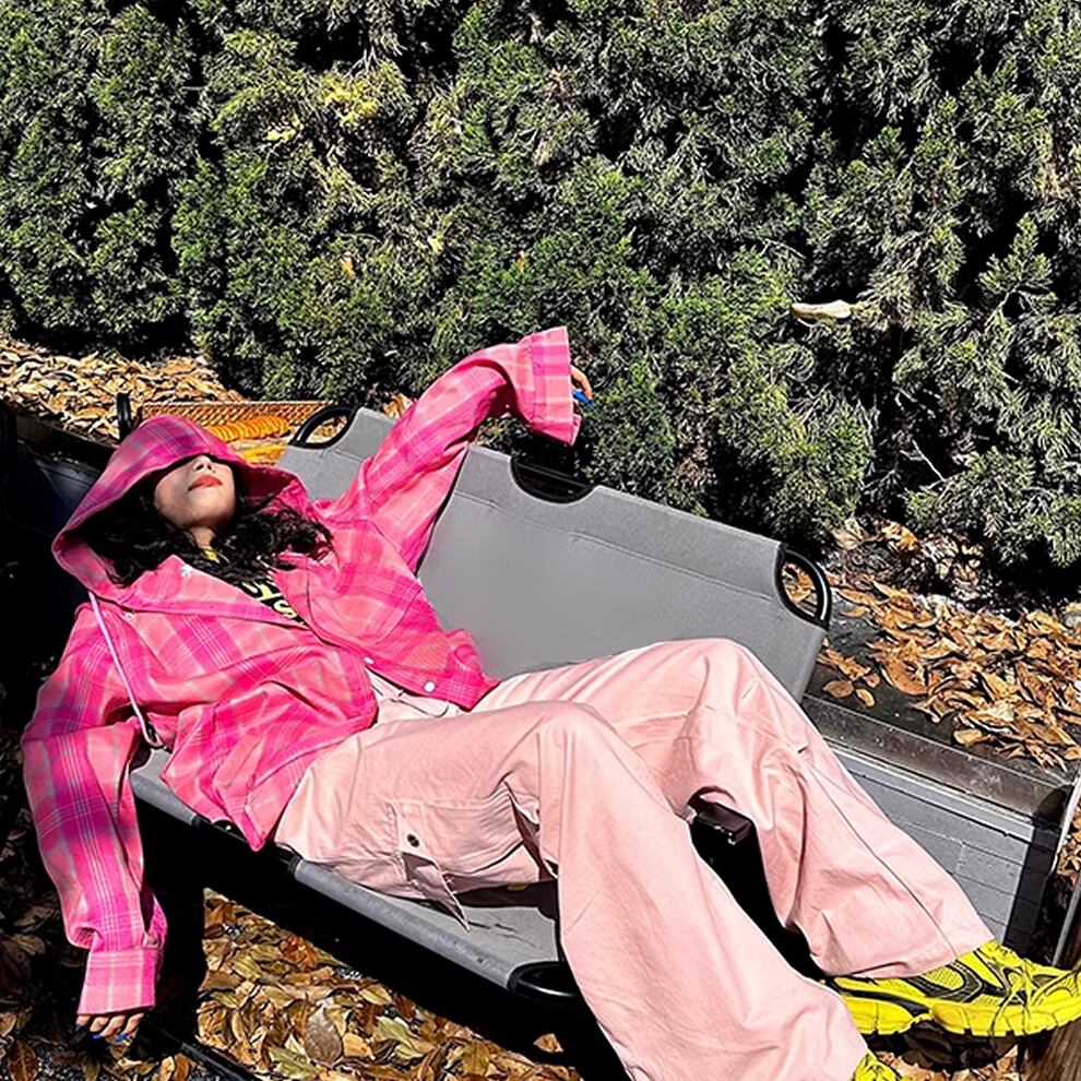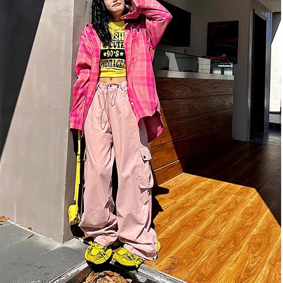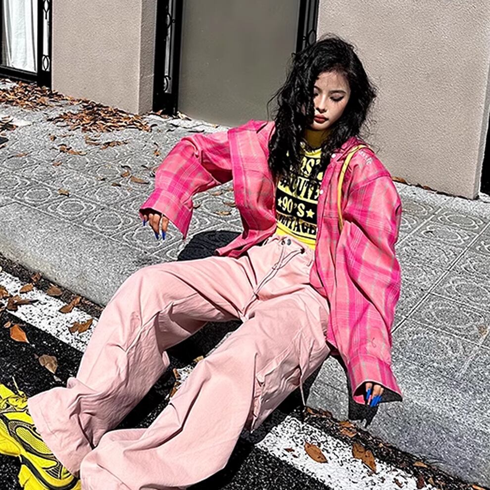 レディース チェック柄 フード付き 長袖 シャツ オーバーシルエット ピンク AS11587