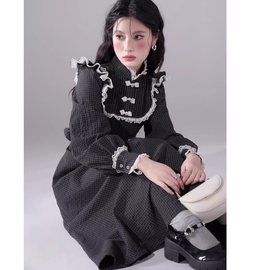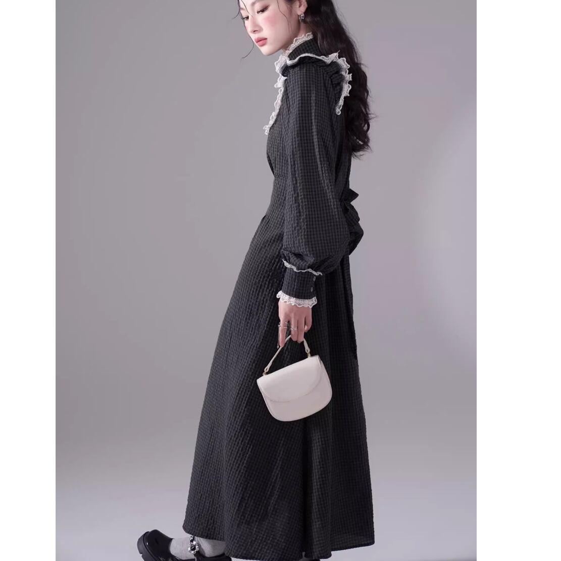 レディース 長袖 チェック柄 ワンピース レース ロング丈 レトロガーリー AS11603