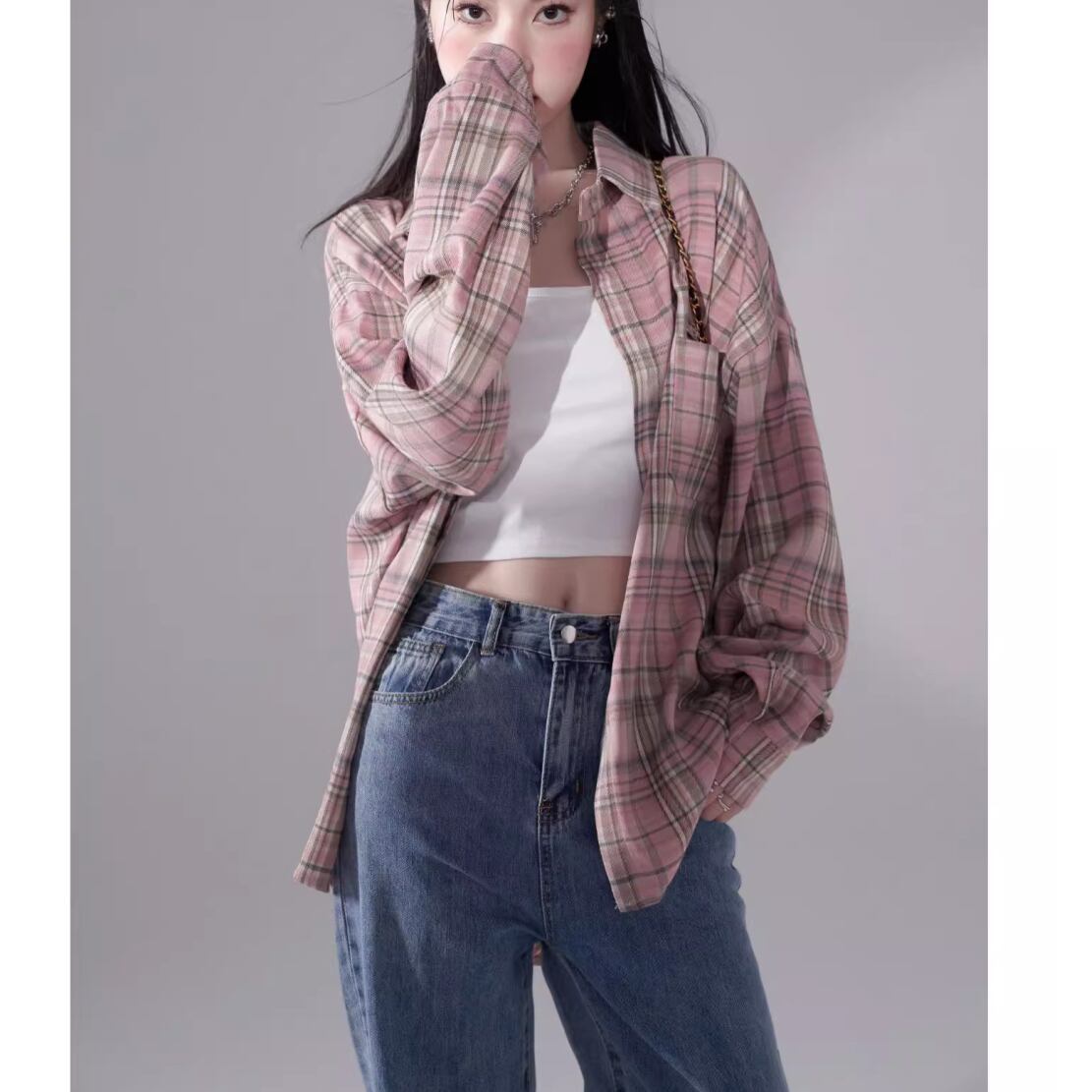 レディース 長袖 チェック柄 シャツ レトロ ピンク AS11604