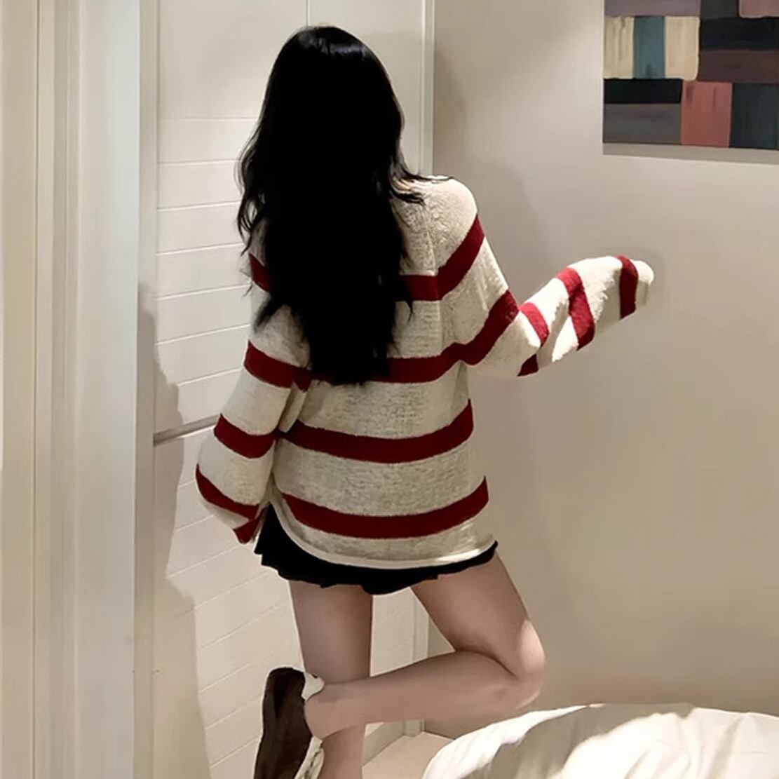 レディース ボーダー柄 セーター 長袖 レトロ レースアップ AS11640