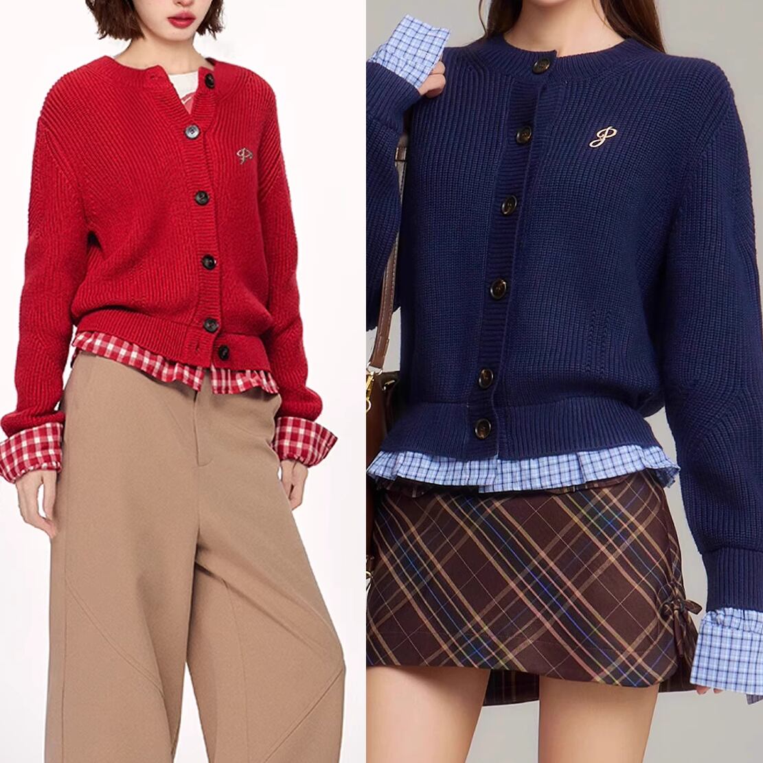 レディース 長袖 カーディガン ドッキングデザイン チェック柄 レッド ネイビー AS11650
