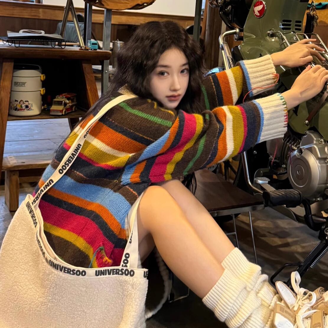 レディース 長袖 ボーダー柄 レインボー カーディガン ショート丈 AS11652