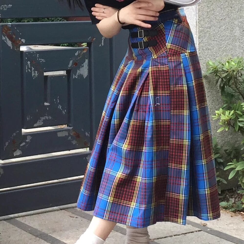 レディース チェック柄 ロングスカート プリーツ レトロ ハイウエスト 赤 青 AS11690