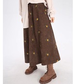 花柄刺繍が可愛い。コーデュロイ素材のロングスカート。