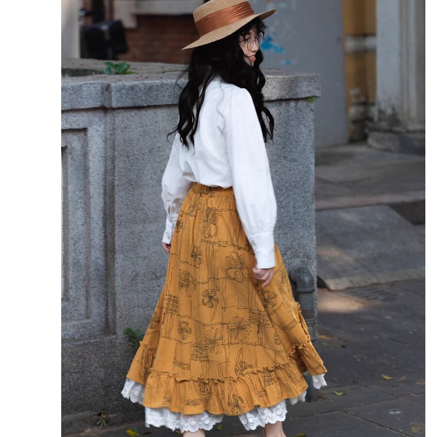 レディース コーデュロイ レース レトロ フリル アシンメトリーデザイン ロングスカート AS11704