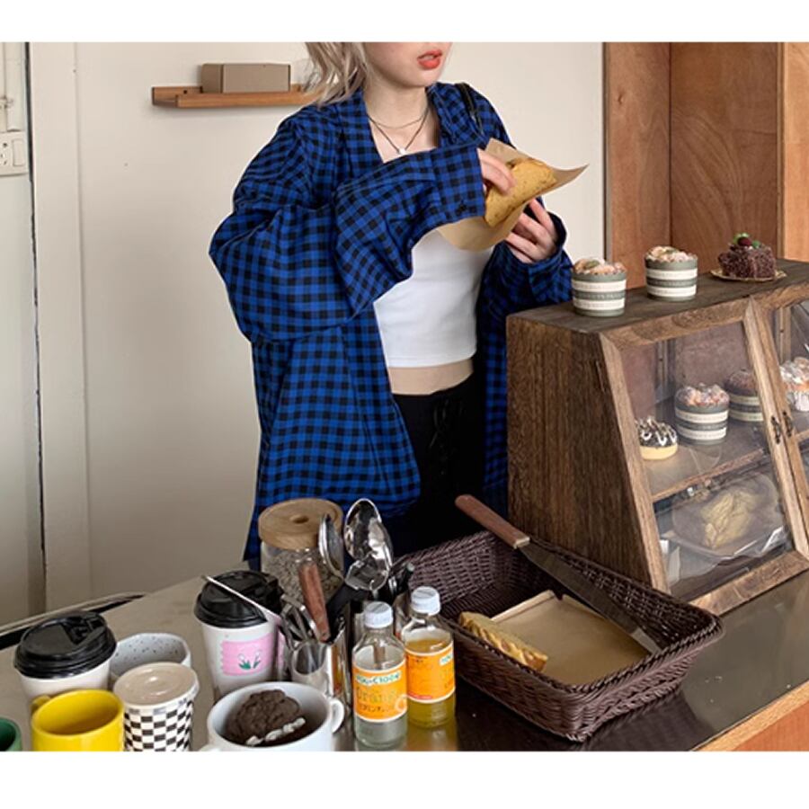 レディース チェック柄 シャツ 長袖 ロング丈 青 ブルー AS11762