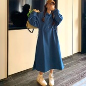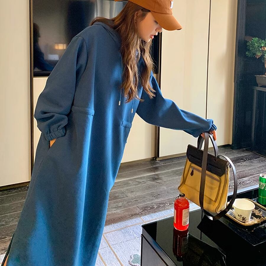 レディース フード付き 長袖 ロングワンピース サイドスリット カジュアル シンプル ブルー AS11781